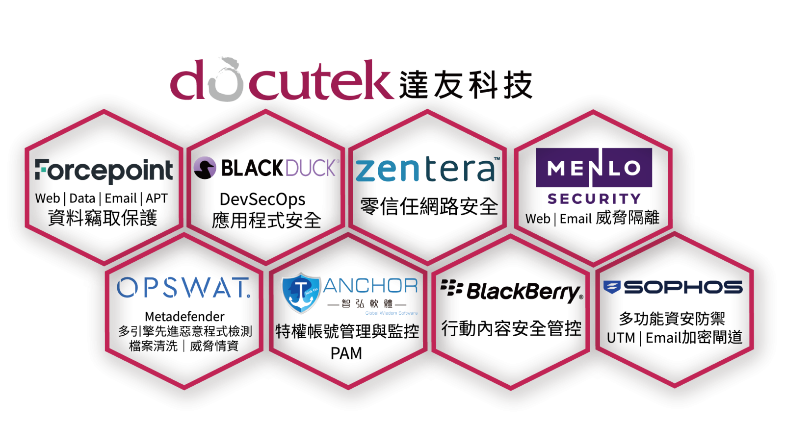 達友科技專業代理銷售的資安品牌有:Forcepoint、BLACK DUCK(原新思科技)、歐普思安 OPSWAT、Zentera、Menlo Security、Blackberry、智弘軟體ANCHOR、SOPHOS